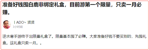 因为《逆水寒》手游目前仍在上升期,有大量新玩家和观望者在陆续入坑,再加上游戏总有“当时没买现在后悔”的玩家存在,因此可以笃定,灵鹿礼盒的价格虽然不至于涨那么多,但依旧前景可观。
