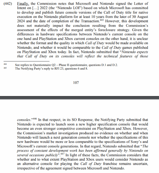 虽然欧盟指出任天堂的说法空口无凭,并表示无法确定任天堂新主机能否Xbox和PlayStation运行《使命召唤》的替代品,但后者坚称他们“已经多次公开确认了持续开发工作的过程”。