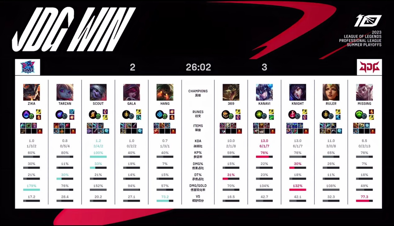 LPL四强阶段的第二场BO5比赛在昨天结束,这场比赛也是再次打满,状态不佳的JDG在最后一局比赛中爆发成功击败LNG,捍卫了联赛大王的位置,率先晋级胜者组。