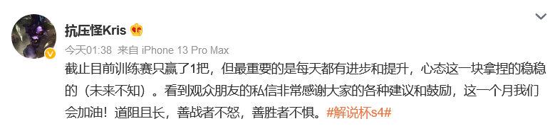 @抗压怪Kris :截止目前训练赛只赢了1把,但最重要的是每天都有进步和提升,心态这一块拿捏的稳稳的(未来不知)。看到观众朋友的私信非常感谢大家的各种建议和鼓励,这一个月我们会加油!道阻且长,善战者不怒,善胜者不惧。