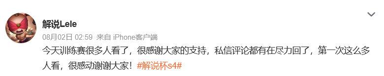 @解说Lele:今天训练赛很多人看了,很感谢大家的支持,私信评论都有在尽力回了,第一次这么多人看,很感动谢谢大家!