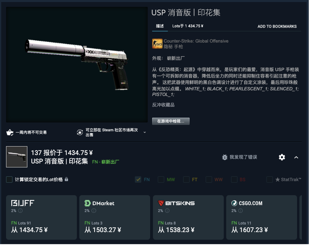 那具体高多少?经过多个热门饰品的对比,可以发现在CSGObuy饰品的出售价格普遍高于国内同类平台10%-20%。这就意味着在国内同类平台卖10w的饰品,在CSGObuy可以卖到11w-12w,这个收益是非常可观的。比如下图这个USP消音版,可以看到在CSGObuy的售卖价格就比国内某平台多了100多块。