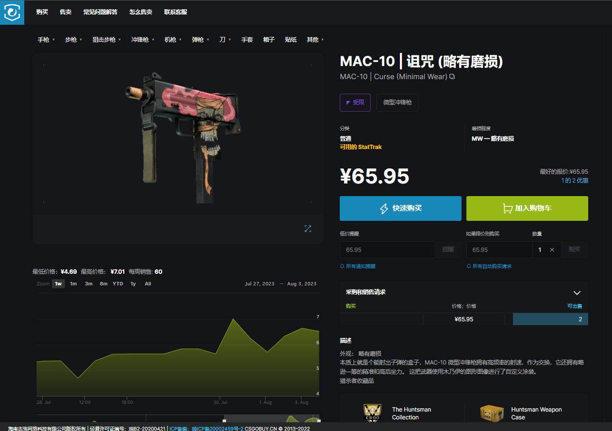 选择了某个饰品皮肤后,可以看到它的基本介绍和这件饰品的最低价格以及其对应的磨损程度。同时这件饰品在平台上的购买次数和购买的最低价格、平均价格、最高价格都可查阅分析,方便买家了解最新行情和交易记录。这样一来,无论是购买或出售起来都十分便捷。