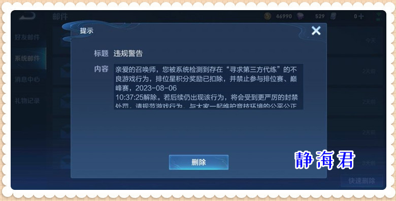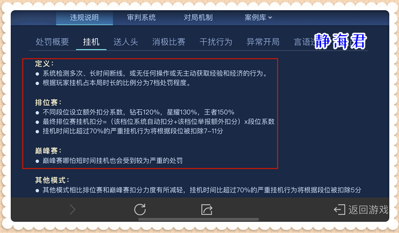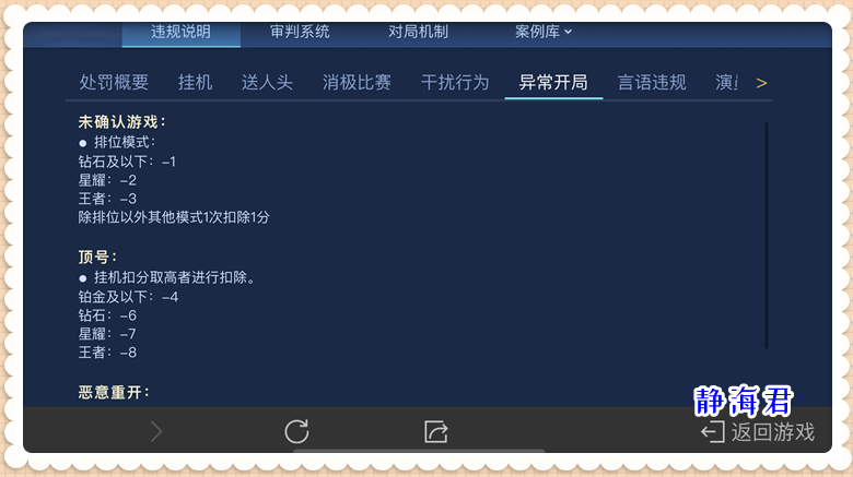 一个小伙伴问我说:“静海君,你遇到过排位被扣10颗星的情况吗?”在收到我没有见过的答复后,这位小伙伴发给我一张图。