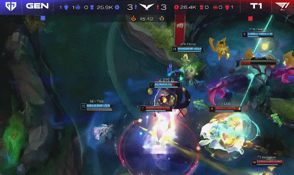 [15:41]二先锋开团,猪妹甩狙定住芮尔,洛补掉芮尔,猪妹收掉先锋,纳尔拍墙泽丽,霞收掉沙皇拿到双杀,T1打出1换4,纳尔收掉先锋之眼推掉GEN中路一塔,经济领先3K。