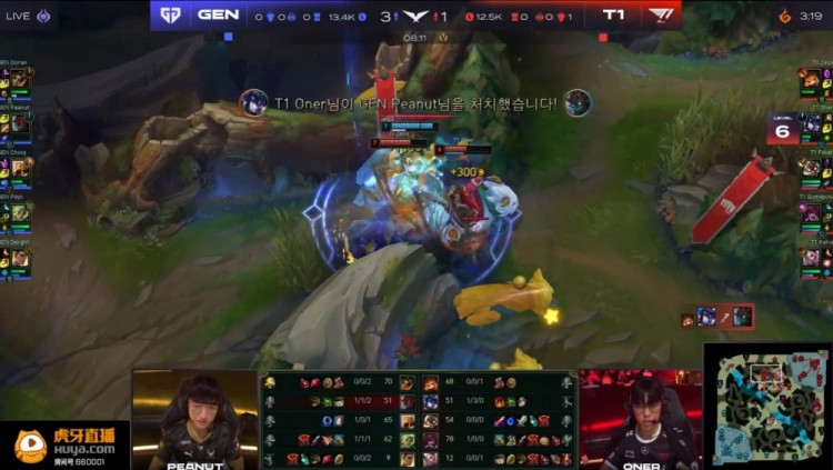 [6:19]T1去开小龙,茂凯拼惩没抢掉龙,猪妹收掉小龙但又被GEN五人群殴致死,沙皇拿到人头。