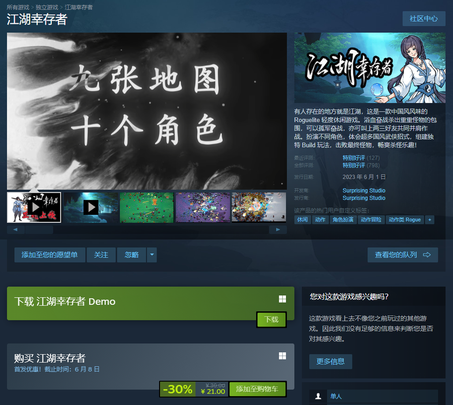 国产游戏《江湖幸存者》现已上架Steam平台,首发期间7折,仅21元。该游戏还提供有试玩版,感兴趣的玩家可以先试玩,后购买。