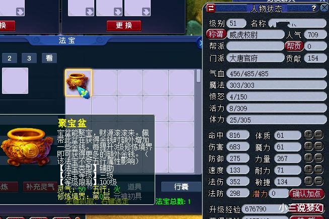 正常的情况下,当大家的角色等级达到60级的时候才会开启法宝系统,拥有了法宝以后的角色能够打出更多的输出,但是上面这位玩家找回来的这个角色有点问题,这是一个51级的角色,现在这个51级的角色却拥有了一个三级的聚宝盆,正常的情况下需要达到100级以后才能够开启三级法宝,那么上面的这个聚宝盆是哪里来的呢?