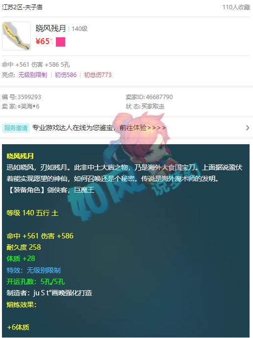 夫子庙服务器的140无级别刀,打完17段宝石,大唐使用的话总伤可以达到937点,最终以65个的价格卖出。与巅峰时期同类型刀的价格相比,现在已经便宜了一半以上。