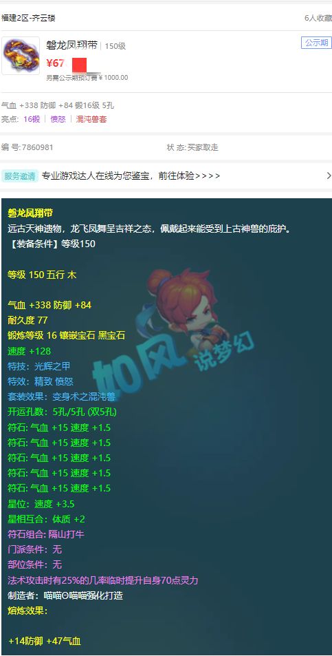 齐云楼159团队的150愤怒精致光辉腰带,熔炼之后防御98点,气血385点,最终以67个的价格卖出,这条腰带对于159天启组来说,绝对是超级神装!